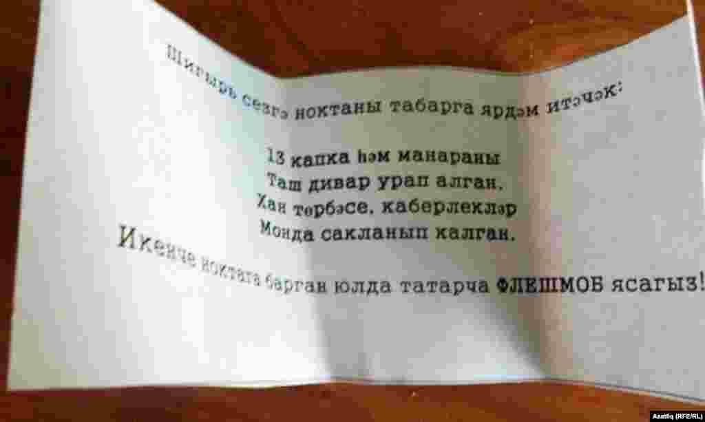 21 апрельдә Казанда "Татар дозор" квест-уены узды. Барлыгы алты такым Казанның Бауман урамы, Кирмән буе, Татар бистәсе, Меңъеллык паркы, Сукно бистәсе һәм башка урыннарда булды. Яшьләр төрле биремнәрне үтәүдән тыш, юлларындагы кибетләргә кереп татар теле кулланылышын күзәтте һәм элмә такталардагы татарча язуларны тикшерде. Түбән Кама шәһәреннән килгән кызлар биремнәрне үтәп билгеләнгән урынга иң беренче булып килеп җитте.