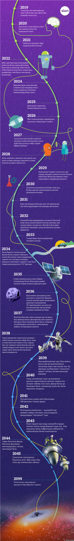Галимнең соңгы 20 елда төрле китапларда, блогларда, чыгышларда, әңгәмәләрдә ясаган барлык фаразларын җыеп карасаң, безнең киләчәк 2019 елдан алып 2099 елга кадәр җентекләп сурәтләнгән дияргә була. Slon интернет-басмасы бу фаразларны бер инфограмга тезеп караган. Без аны Азатлык укучыларына да тәкъдим итәбез.