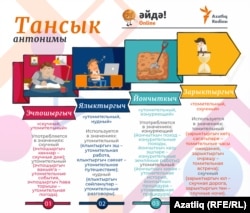 - Тансык – “желанный, интересный”, употребляется в значениях: желанный (тансык сәгатьләр – желанные часы, тансык яңалык – желанная новость, тансык бала – желанный ребенок); редкостный или долгожданный (тансык аш – долгожданный суп, тансык балык – редкостная рыба); интересный (тансык китап – интересная книга, тансык вакыйга – интересное событие).