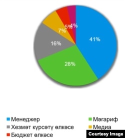 Соңгы биш елда (за последние 5 лет) һөнәрләр бүленешендә зур үзгәрешләр булмаган (не было больших изменений). Бүген иң күбе (самое большее) менеджерларга (34 игълан) ихтыяҗ зур (большая необходимость). Бу вакансияләрнең 41 процентын тәшкил итә (составляет). Икенче урында — укытучылар (учителя) һәм тәрбиячеләр (воспитатели): 23 игълан. Хезмәт күрсәтү өлкәсендә (в сфере оказания услуг) — 13, медиа өлкәсендә — 6, бюджет эшендә — 4, сall-үзәк операторы — 3 вакансия бар.